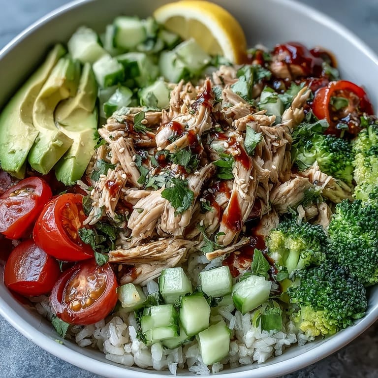 Save There's something deeply satisfying about assembling a bowl that looks like it belongs in a magazine, except you made it in your own kitchen in the time it takes to brew coffee. I discovered the magic of rotisserie chicken bowls on a Tuesday afternoon when I was staring into my fridge, exhausted from decision fatigue, and realized that sometimes the best meals come from letting each ingredient shine without overthinking it. That first bite—warm grain, cool cucumber, creamy avocado, and a tangy sauce—felt like I'd cracked some secret code about eating well without the stress. What started as a practical solution became my answer to "what's for dinner" at least twice a week.